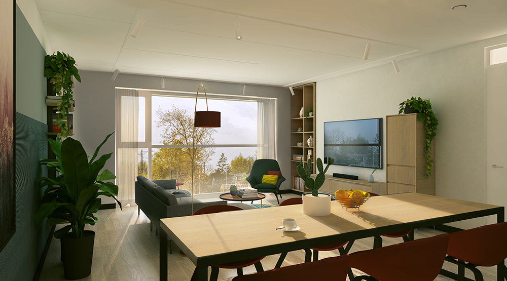 De keuken en woonkamer vormen samen een grote open ruimte die je naar eigen wens kunt indelen. Of je nu graag aan tafel eet met de balkondeur open, of dat de sofa op die plek staat zodat je languit liggend van het uitzicht kunt genieten, de plattegrond biedt tal van mogelijkheden. Maak optimaal gebruik van deze flexibiliteit, zodat het inrichten van je appartement niet alleen een opgave is, maar ook een boeiend avontuur.