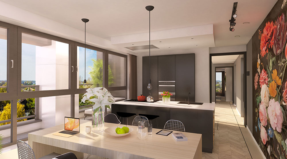 Stel je voor: je opent je voordeur, stapt je woning binnen en wordt meteen begroet door een zwerm vogels die langs je raam trekt. Dat is het unieke welkom van een Penthouse1 appartement op de 10e en 11e verdieping. Hier, met dit adembenemende uitzicht, waan je je ‘on top of the world’.